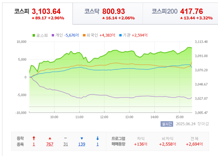 2025년 6월 24일 KOSPI는 3년 9개월 만에 3,100선을 돌파하며 3,103.64로 마감했습니다. 이는 전 거래일 대비 2.96% (89.17포인트) 상승한 수치입니다. 코스닥 지수 또한 11개월여 만에 800선을 회복했습니다.